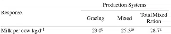 Figure 1. Milk production responses seen when feeding either a grazing, mixed or total mixed ration diet.